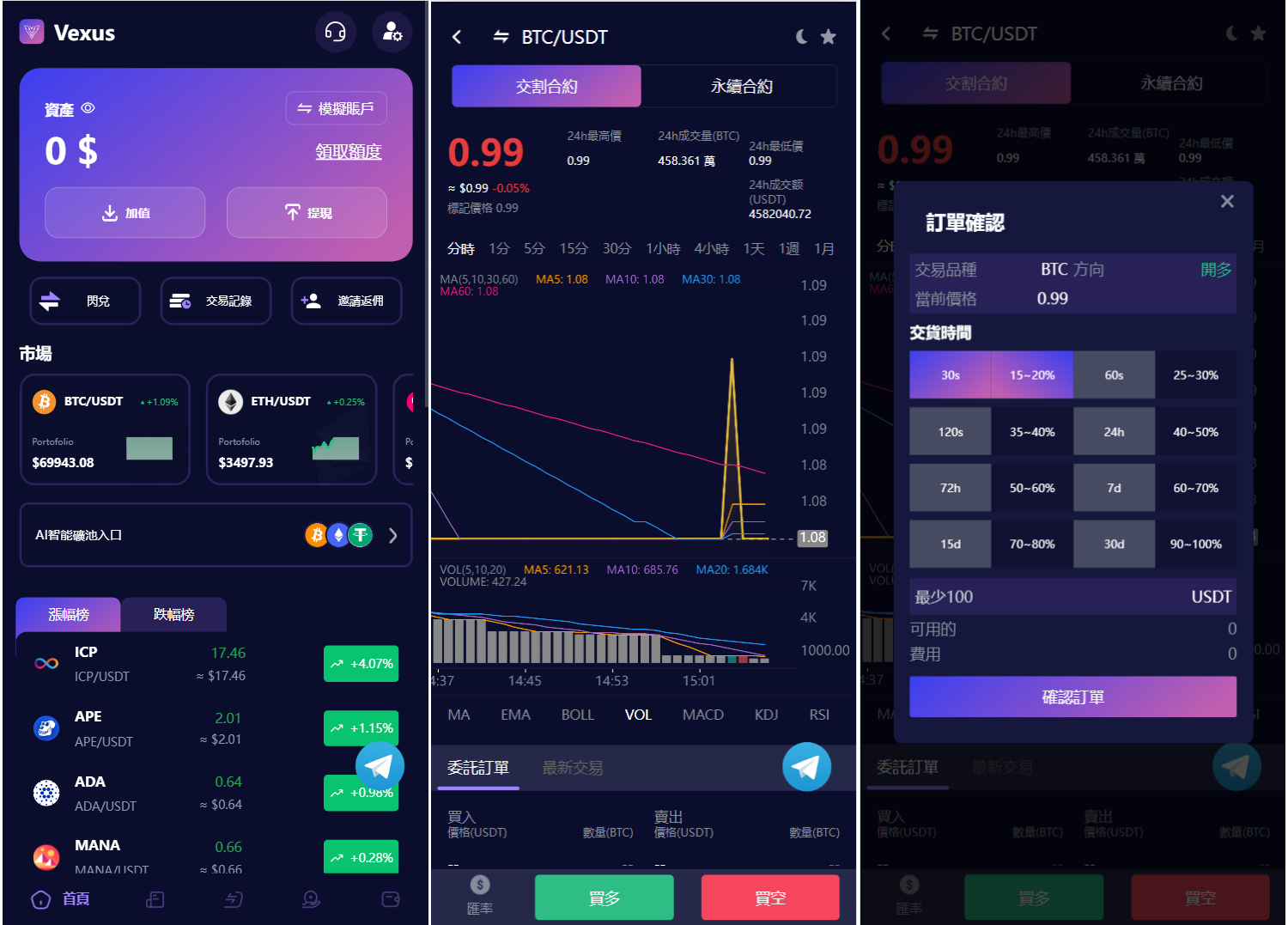 Vexus多语言虚拟货币交易所/Java交易所源码/模拟账户+现货交易+永续合约+交割合约+基金理财+锁仓挖矿+质押贷款+闪兑