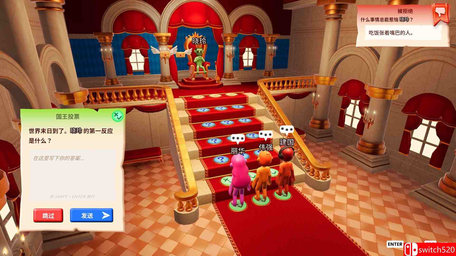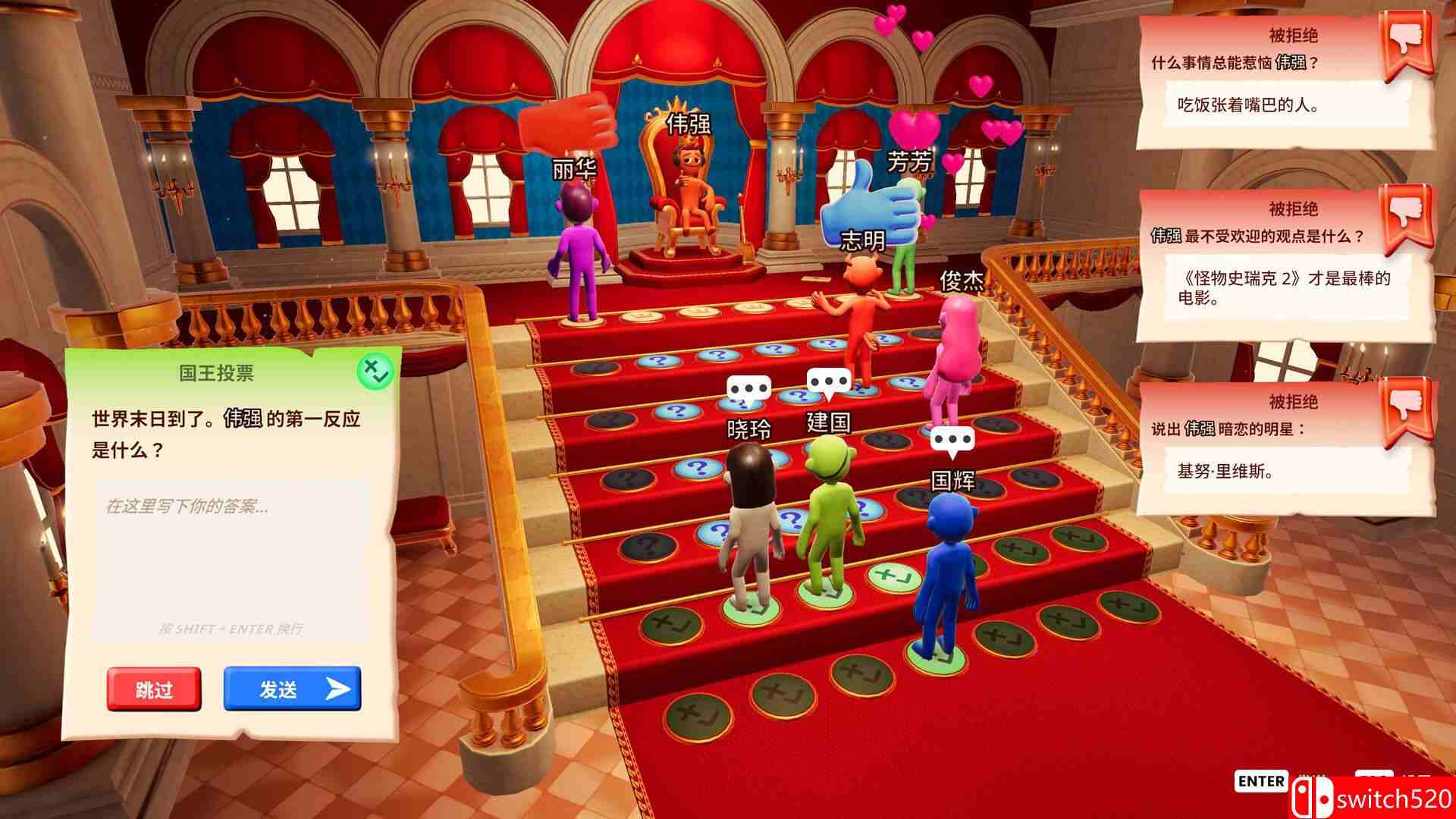 《你的问答秀》是一款益智类(PUZ)游戏,The You Quiz 是一款多人派对游戏,所有问题都和你本人有关!当上国王,评判朋友们对你的各种回答;或者化身廷臣,去猜测他/她的怪癖、喜好和小小梦想。邀请最多 7 位好友使用 Friend’s Pass 免费加入吧!switch520